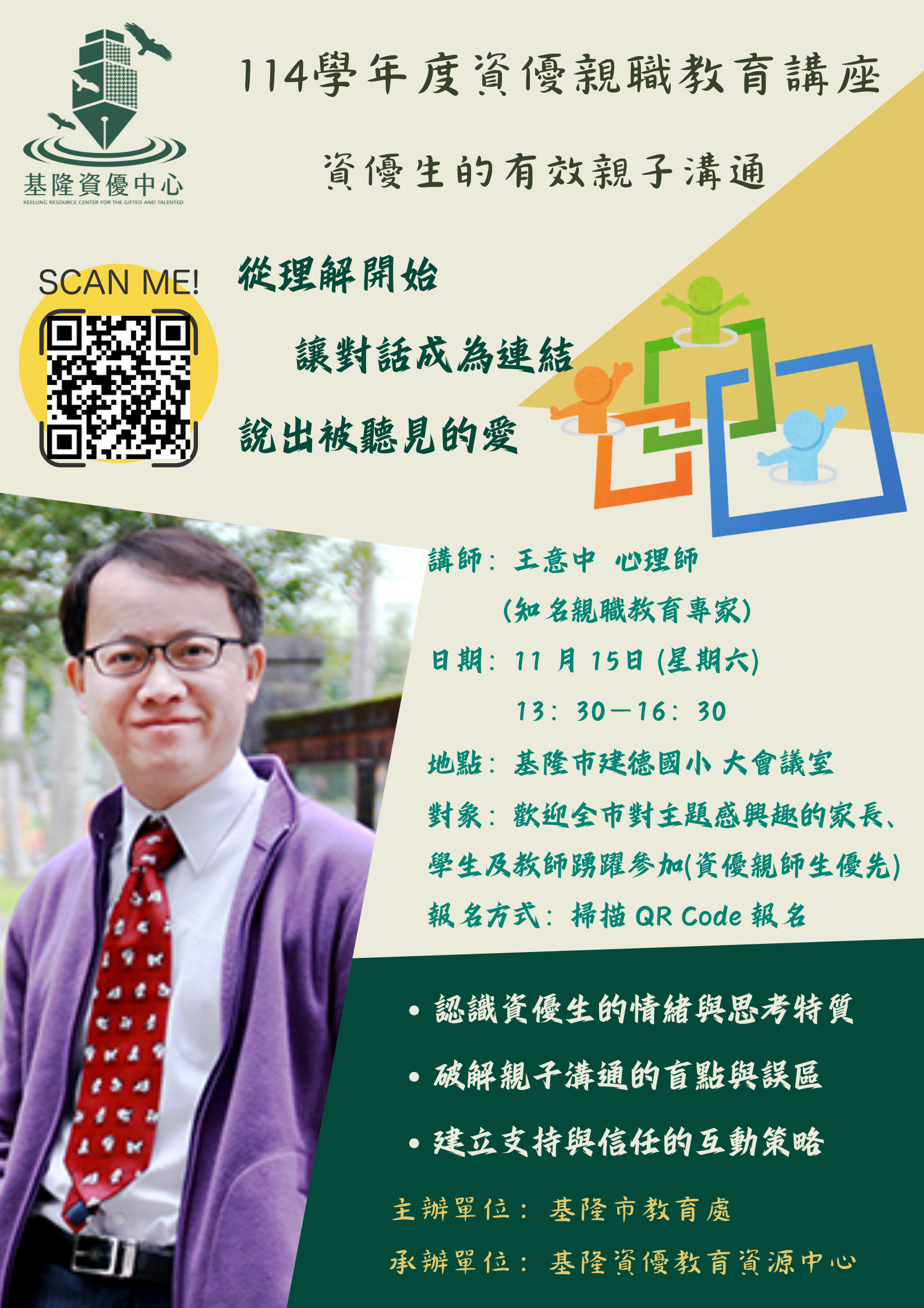 轉知本市資優教育中心辦理親職教育講座「資優生的有效親子溝通」,敬請參考。